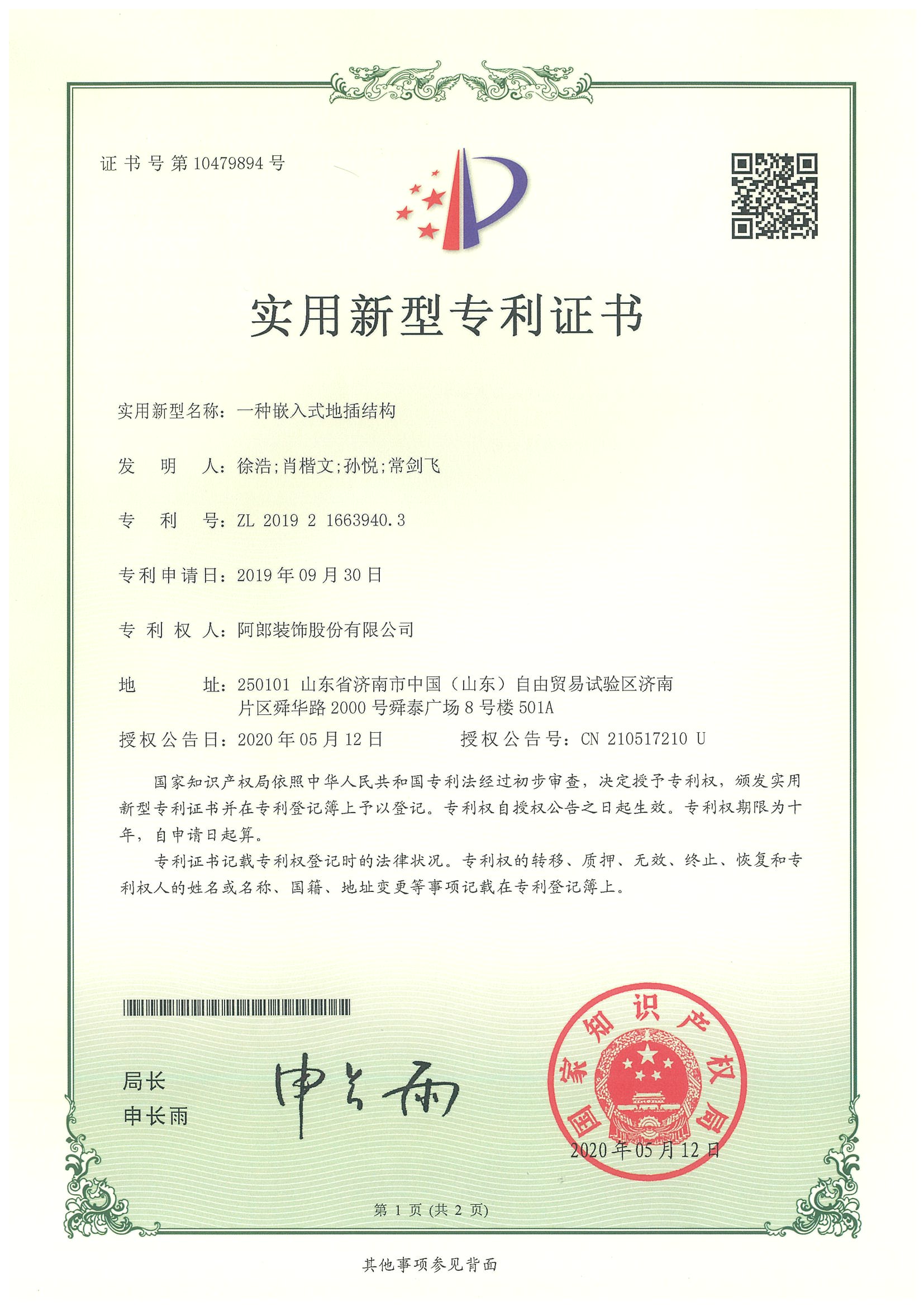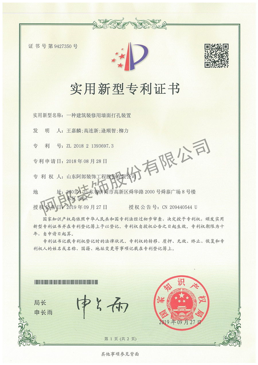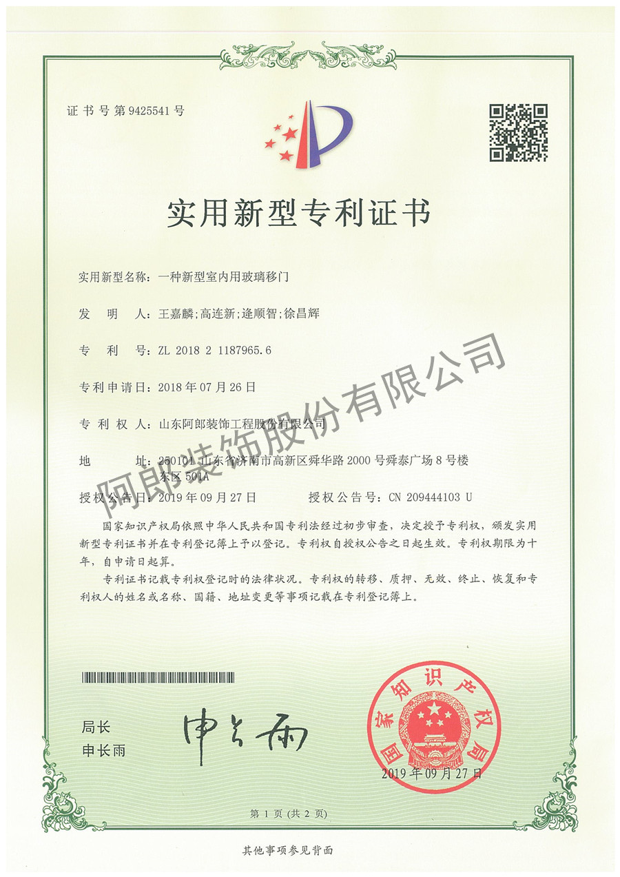 阿郎发展专利证书