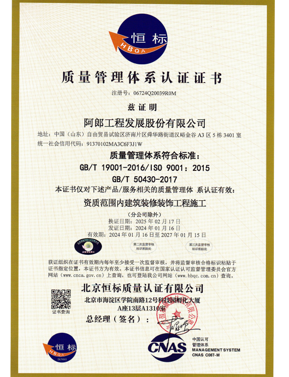 阿郎发展质量管理体系认证证书