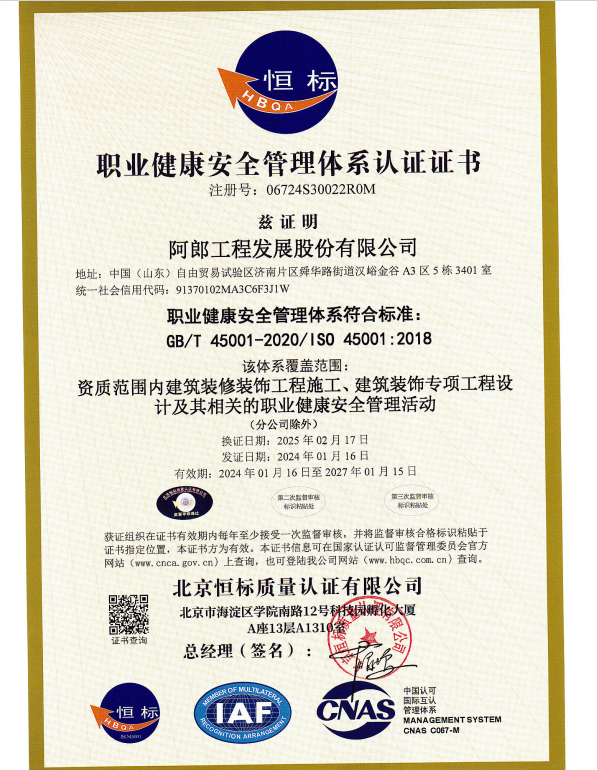 阿郎发展股份有限公司拥有建筑装修装饰工程专业承包壹级、建筑幕墙工程专业承包壹级、建筑装饰工程设计专项甲级、建筑幕墙工程设计专项甲级、房屋建筑工程施工总承包贰级、钢结构工程专业承包贰级、特种专业工程(结构补强)等资质,并已取得 ISO9001 质量管理体系认证、ISO14001 环境管理体系认证及 GB/T28001-2001 职业健康安全管理体系认证。