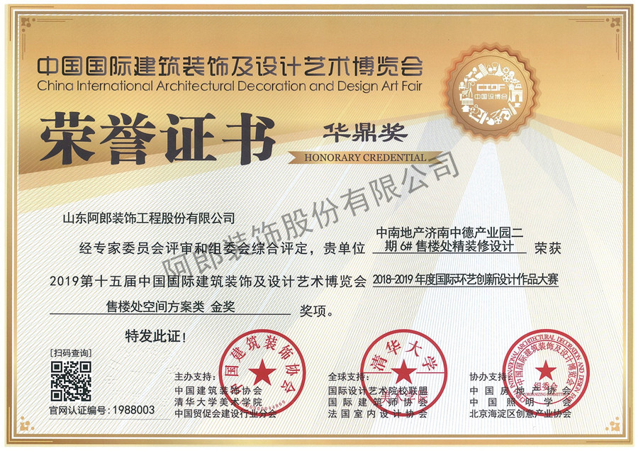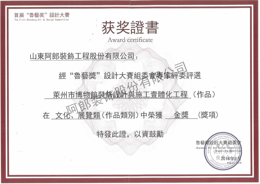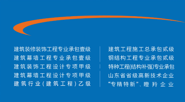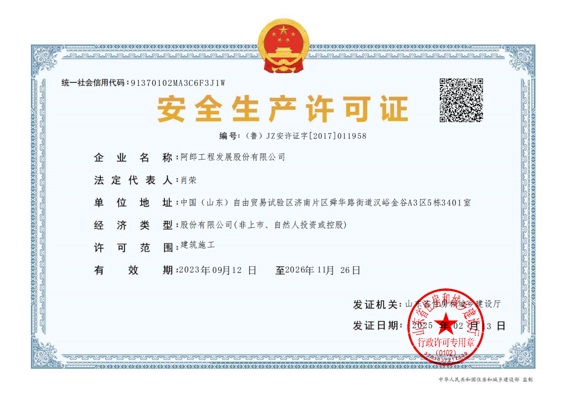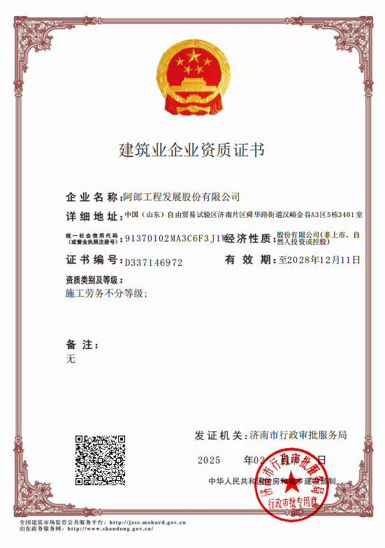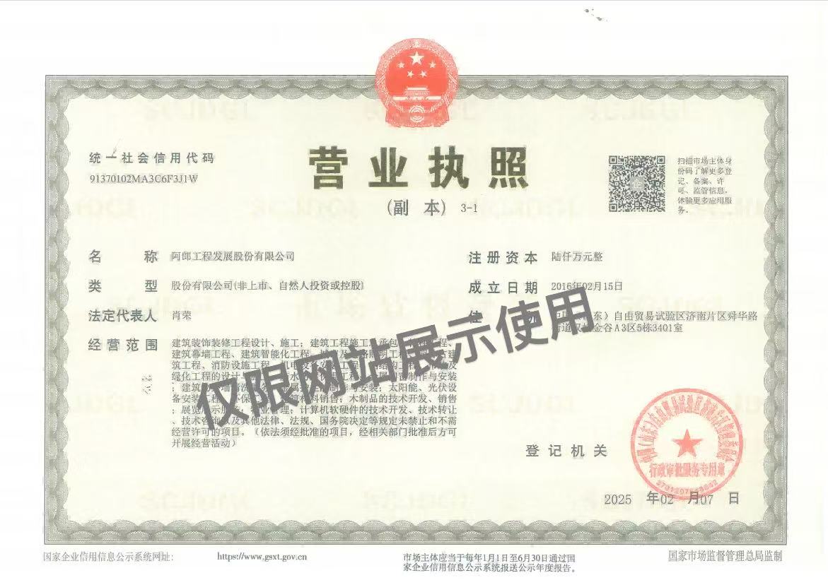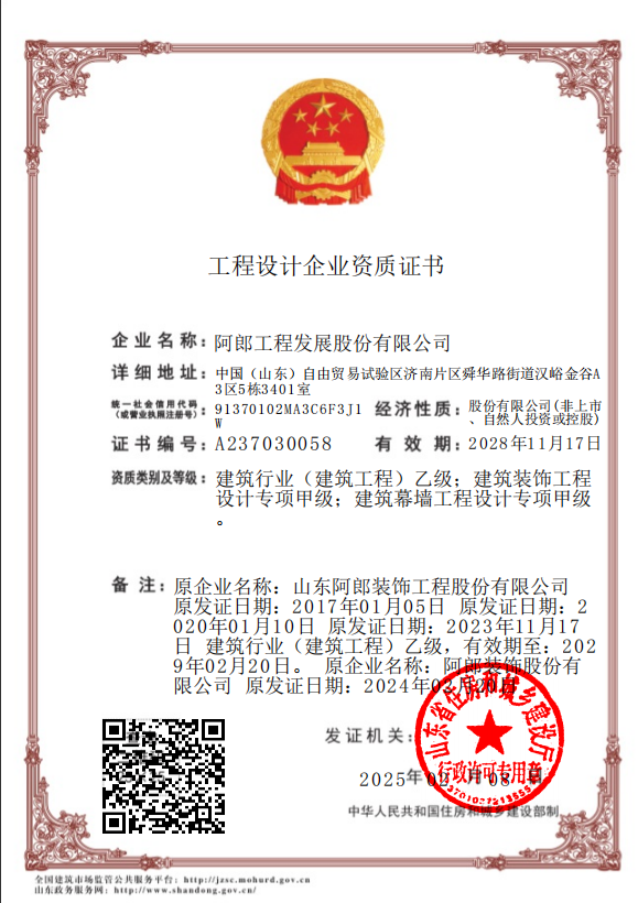 阿郎发展股份有限公司拥有建筑装修装饰工程专业承包壹级、建筑幕墙工程专业承包壹级、建筑装饰工程设计专项甲级、建筑幕墙工程设计专项甲级、房屋建筑工程施工总承包贰级、钢结构工程专业承包贰级、特种专业工程(结构补强)等资质,并已取得 ISO9001 质量管理体系认证、ISO14001 环境管理体系认证及 GB/T28001-2001 职业健康安全管理体系认证。